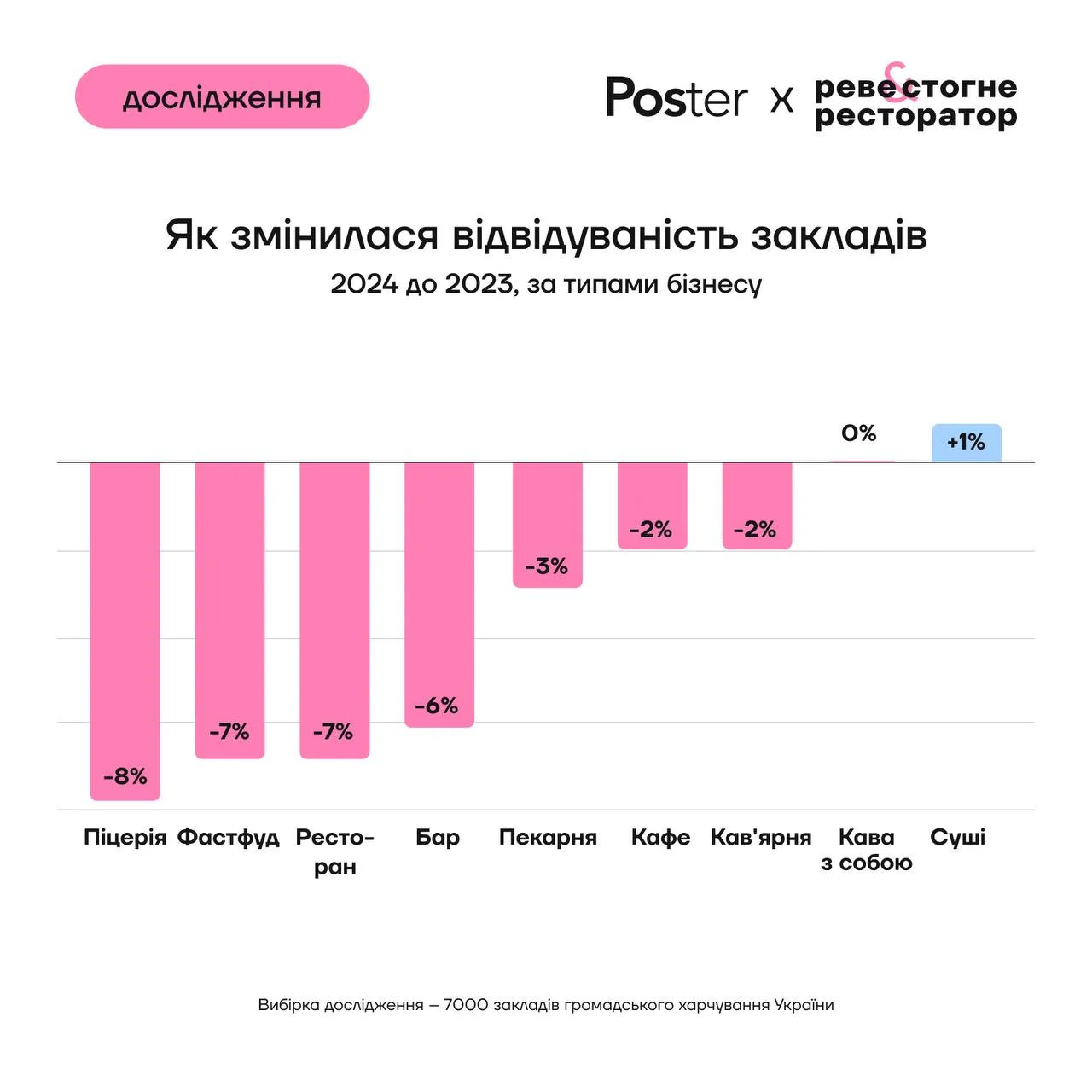 Найбільше просіли показники у піцерій, фастфуду та ресторанів — на 8% і 7% відповідно.