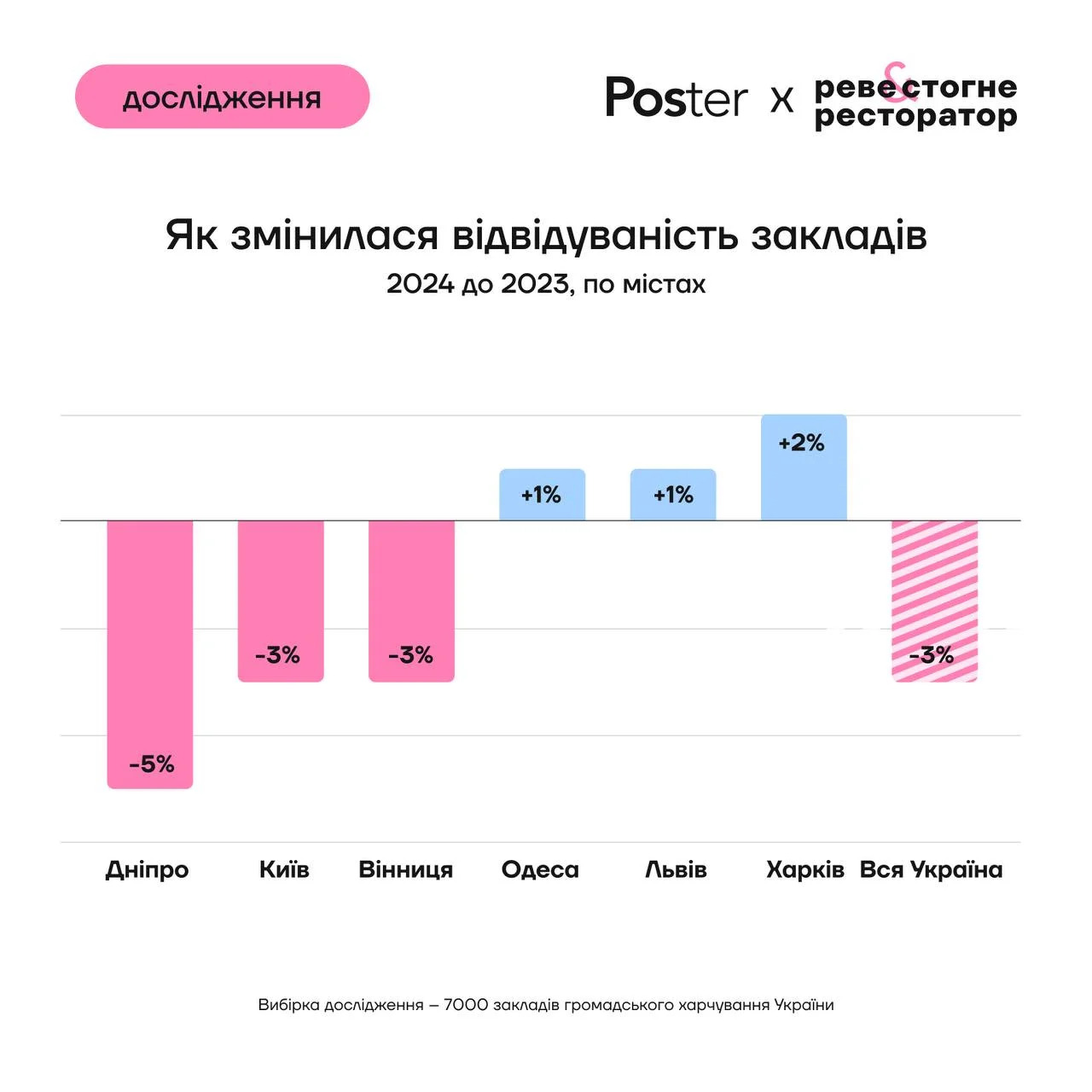 Серед найбільших міст України найгіршу річну динаміку відвідуваності показав Дніпро. Там відвідуваність закладів впала на 5% у 2024 році порівняно з 2023. Кращою, ніж торік, ситуація виявилася в Харкові - зростання на 2%, Львові та Одесі - зростання на 1%. Негативну динаміку відчули в закладах Києва та Вінниці - мінус 3% до виручки.