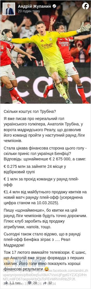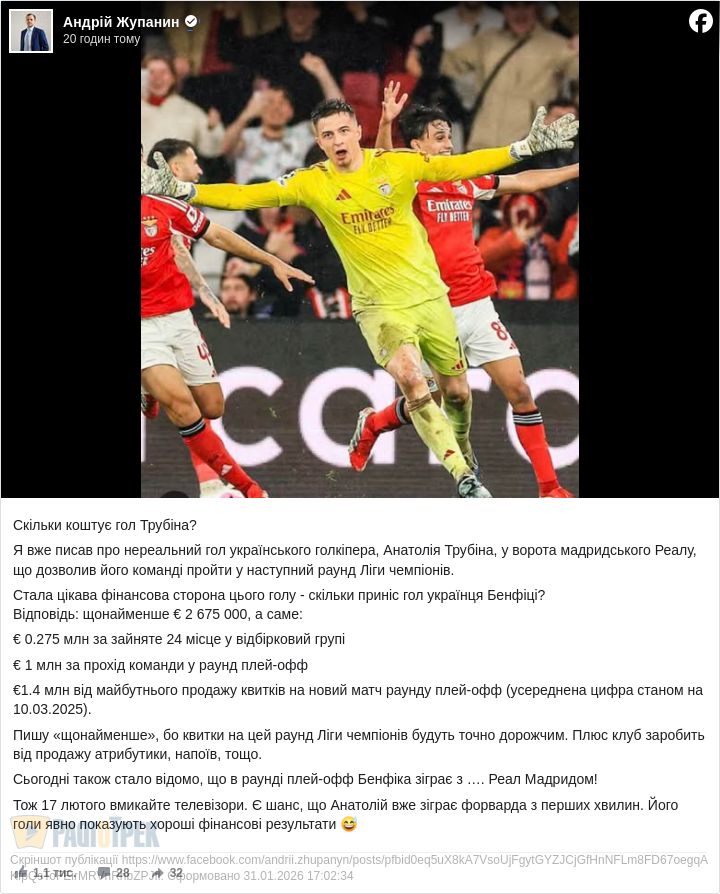 «Скільки коштує – гол Трубіна у ворота «Реала»?»: цікавий підрахунок від Андрія Жупаніна