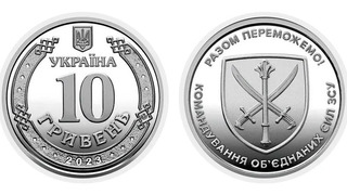 По колу розміщено напис українською мовою: «Разом переможемо» у верхній частині, «Командування об’єднаних сил ЗСУ» — у нижній частині.
