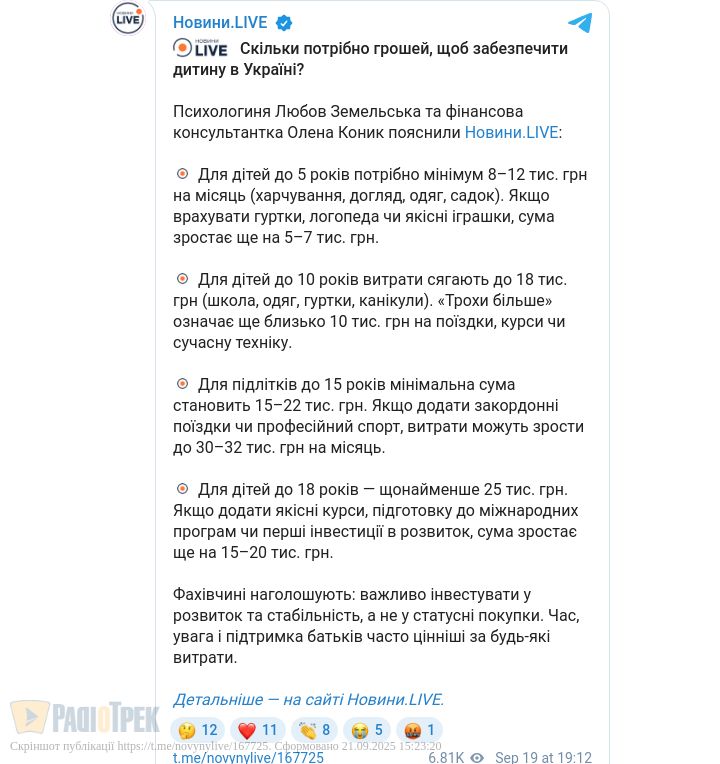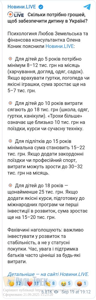 Необхідне мінімальне забезпечення: від 25 тис. грн/міс (харчування, освіта, дозвілля, одяг).