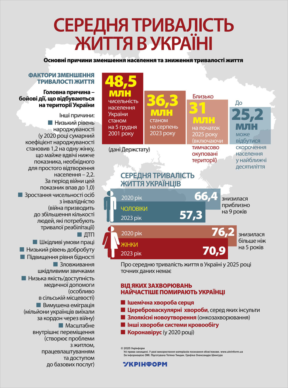 Тобто українські чоловіки живуть на 9 років менше, а жінки — майже на 5 років менше, ніж до війни.