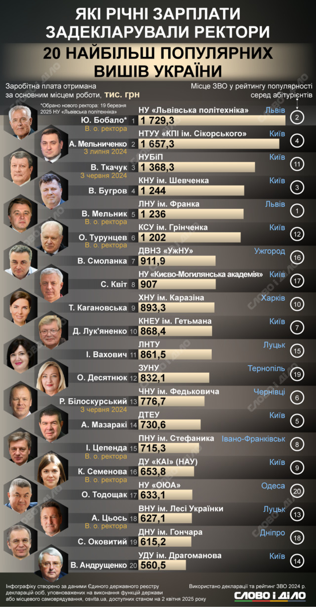 Якими були зарплати ректорів українських ТОП-ЗВО, згідно з попереднім рейтингом, дізнавайтеся з нашого минулорічного матеріалу: