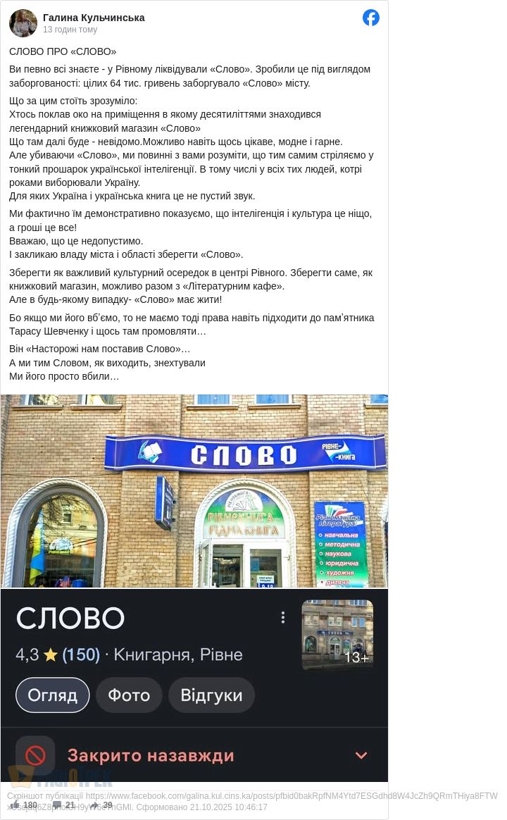 Зникли книгарні «Просвіта», «Знання» і тепер «Слово»…
