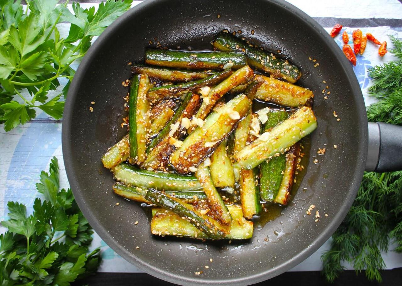 Розігріваємо сковорідку з олією і викладаємо туди нарізані огірки та додаємо кілька шматочків гострого перцю. Смажимо на сильному вогні, постійно помішуючи, 5 хвилин.