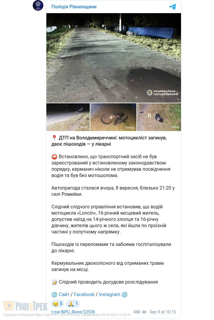 Смертельна аварія на Рівненщині: 16-річний мотоцикліст збив підлітків та загинув
