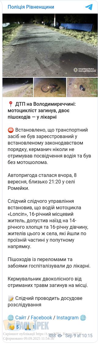 Слідчий встановив, що водій мотоцикла «Loncin», 16-річний місцевий житель, збив 14-річного хлопця та 16-річну дівчину, жителів цього ж села, які йшли по проїзній частині у попутному напрямку.
