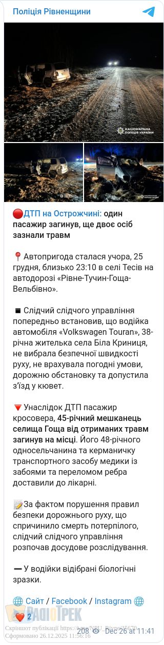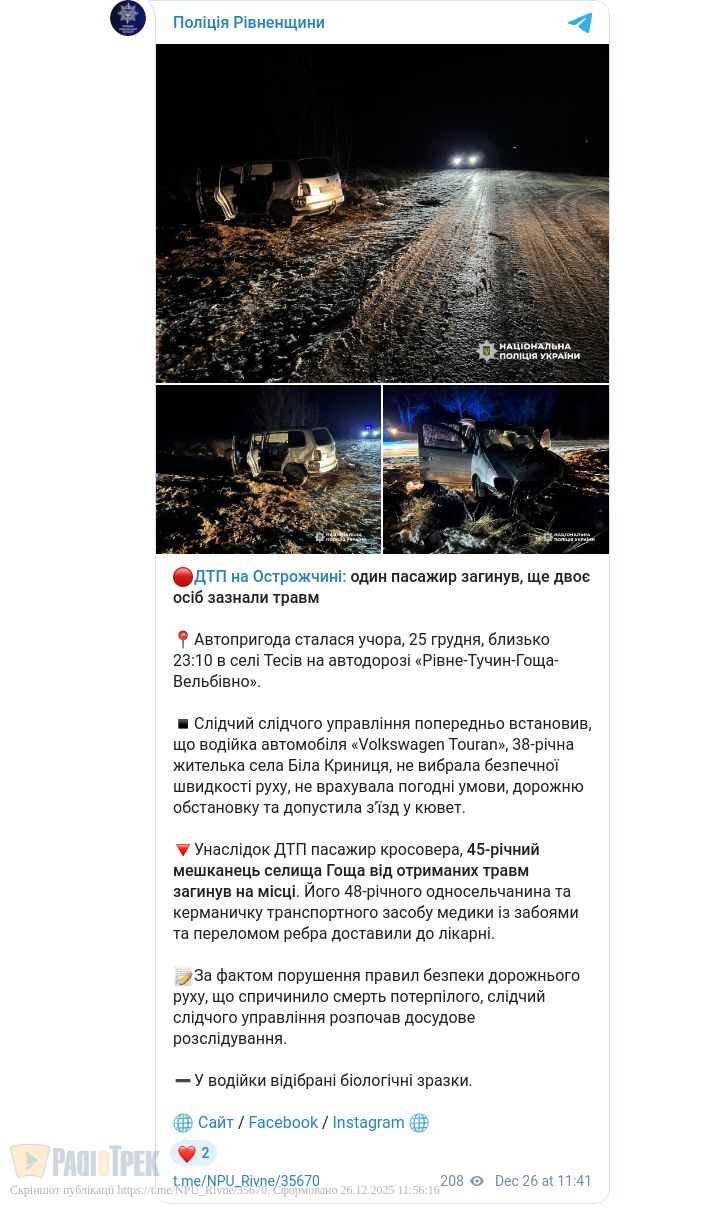 У селі Тесів на автодорозі «Рівне–Тучин–Гоща–Вельбівно» 25 грудня близько 23:10 сталася ДТП.