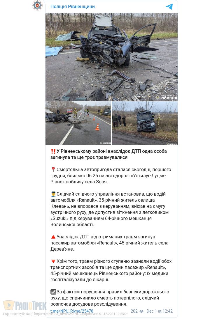 Слідчий встановив, що 35-річний водій Renault виїхав на смугу зустрічного руху, де зіткнувся з Suzuki. Внаслідок ДТП від отриманих травм загинув 45-річний пасажир автомобіля Renault.