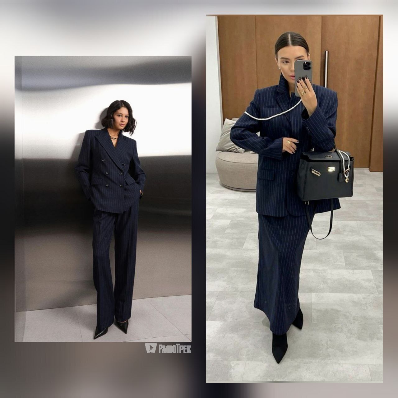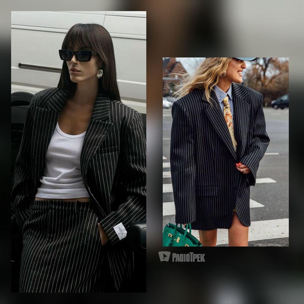 Особливо актуальними стали смугасті костюми в стилі нульових з об'ємними жакетами, які вуличні модниці комбінували з короткими топами, білими сорочками та стильними аксесуарами, такими як краватки. Це поєднання стало must-have як для офісу, так і для більш неформальних заходів чи навіть побачень.