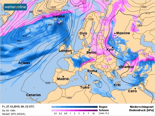 27-го грудня найбільша ймовірність снігу та мокрого снігу буде в західних областях України. І там – чи не найхолодніше, протягом дня 0+3 градуси.