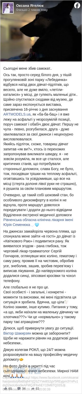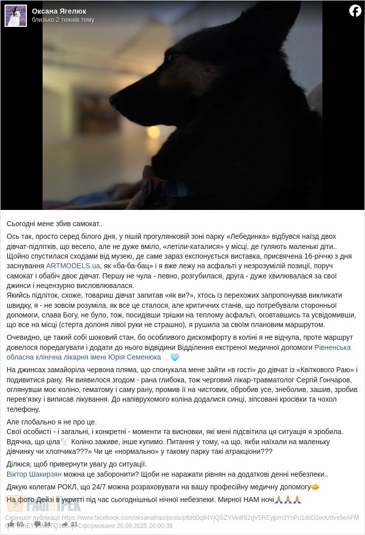 Ось так, просто серед білого дня, у пішій прогулянковій зоні парку «Лебединка» відбувся наїзд двох дівчат-підлітків, що весело, але не дуже вміло, «летіли-каталися» у місці, де гуляють маленькі діти...