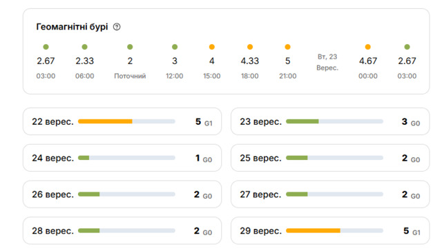 Сьогодні, 22 вересня, Землю накрила чергова магнітна буря. За даними сервісу Meteoweser, після обіду рівень геомагнітної активності почне зростати, а ввечері досягне червоного рівня (буря класу G1). Про це пише Стіна.