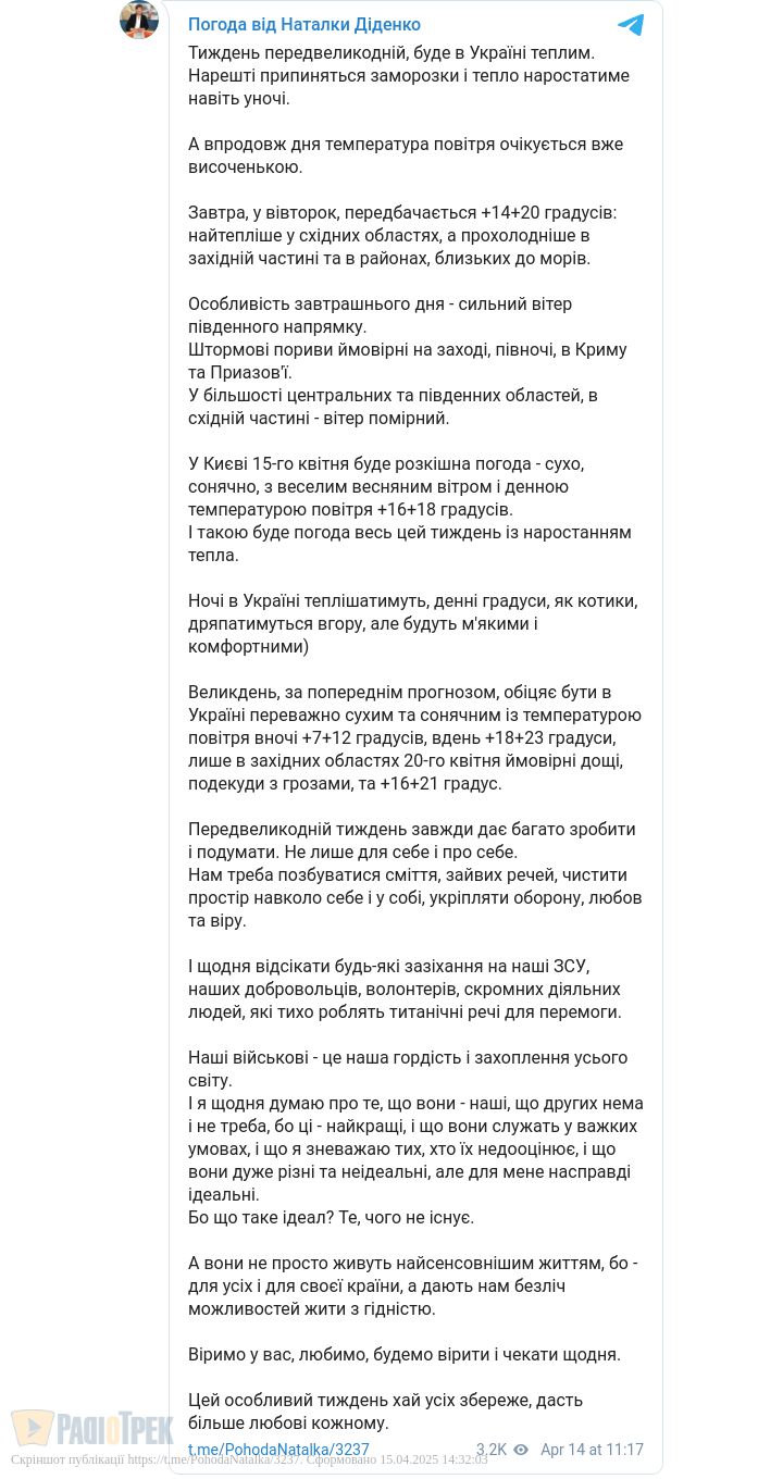 Синоптик Наталка Діденко дала оновлений прогноз погоди на Великдень.