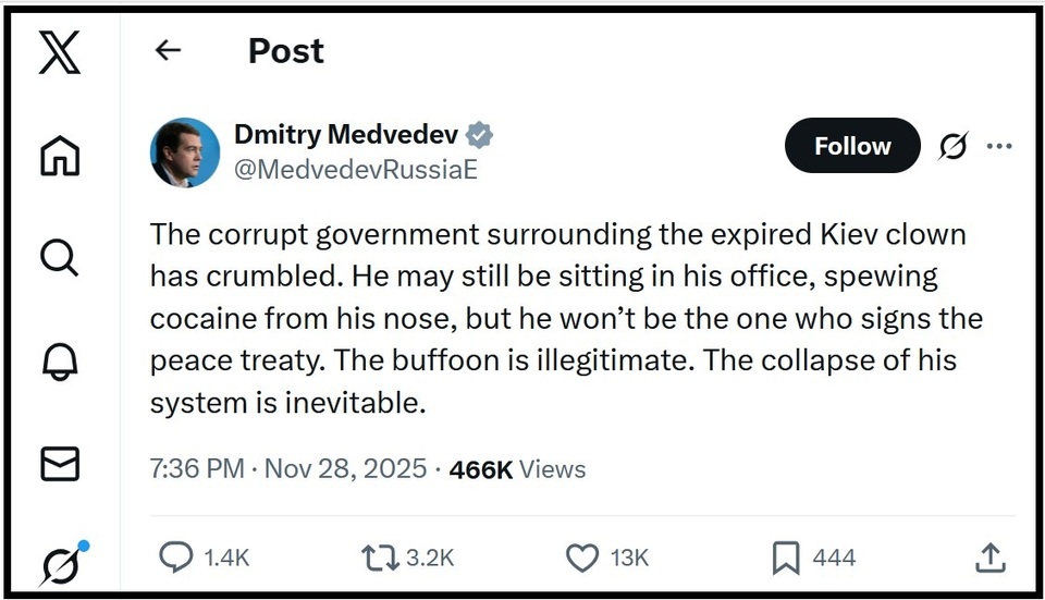 Буквально слідом за Спартц свій коментар на подію виклав і давній друг України, який відкрито прагне її знищення – Дмитро Мєдвєдєв