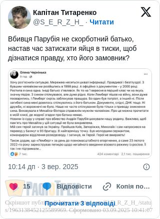 Вище наведено допис матері загиблого героя Лемберга, тіло якого, начебто, хоче знайти десь на окупованих територіях убивця Парубія.