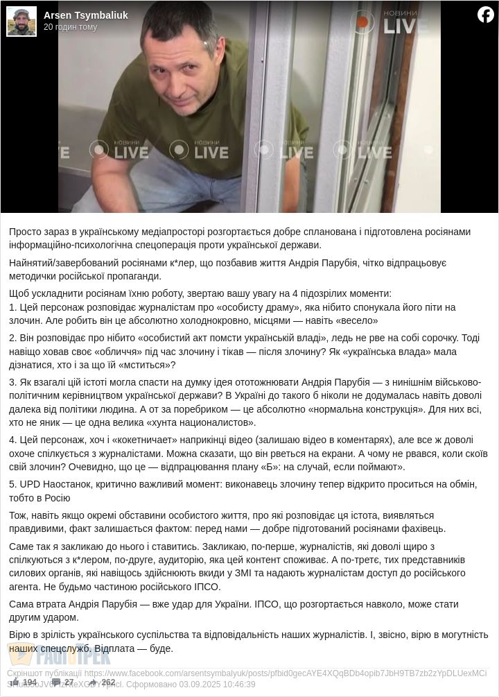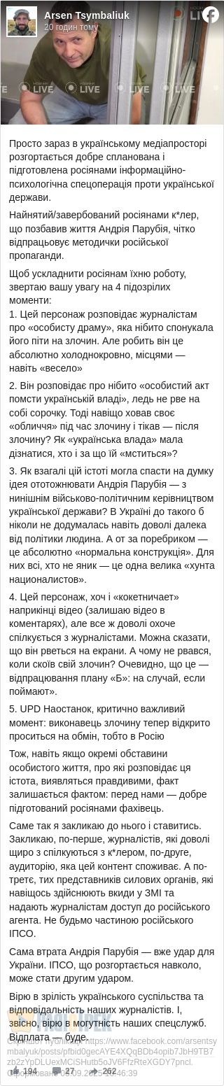 Нижче о Оригінальний допис Арсена Цимбалюка.
