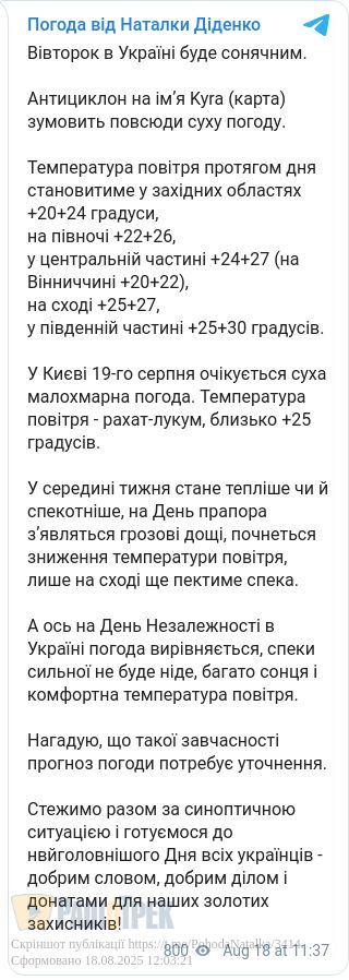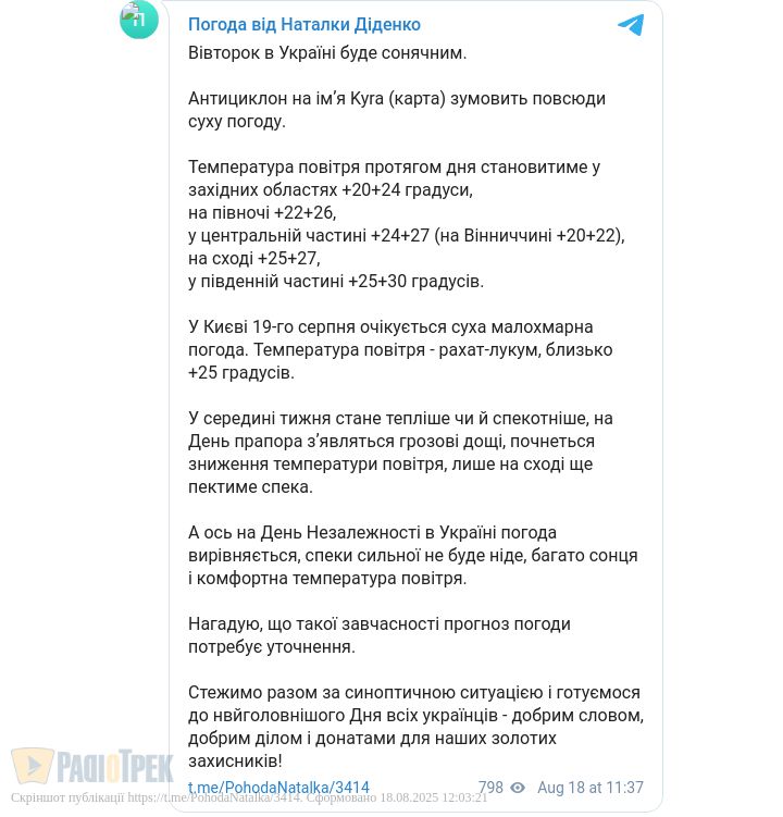 Завтра, 19 серпня, антициклон Kyra повсюди зумовить суху погоду.
