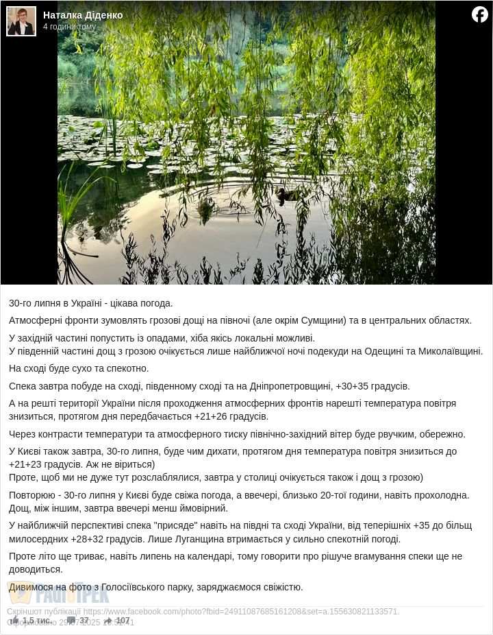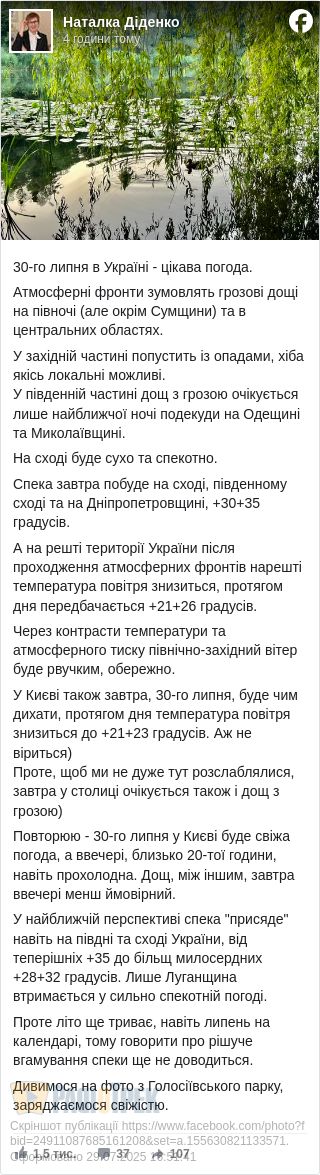 Завтра, 30 липня, атмосферні фронти зумовлять грозові дощі на Півночі та в Центрі України. У південній частині країни дощ з грозою очікується лише найближчої ночі. Подекуди дощитиме на Одещині та Миколаївщині, повідомила синоптик Наталка Діденко.