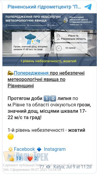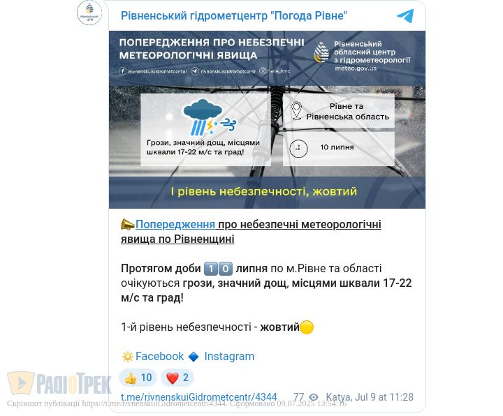 Завтра, 10 липня, на Рівненщині очікується негода.