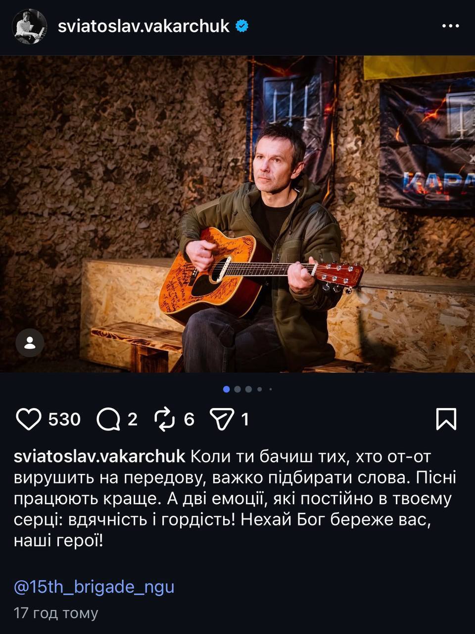 Святослав Вакарчук показав емоційні кадри зі свого концерту для бійців 15-ї бригади Національної гвардії України, підкресливши, що музика іноді говорить більше за слова, коли йдеться про підтримку наших захисників.