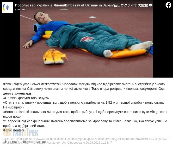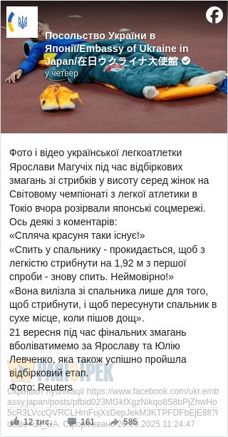 Фото і відео української легкоатлетки Ярослави Магучіх під час відбіркових змагань зі стрибків у висоту серед жінок на Світовому чемпіонаті з легкої атлетики в Токіо розірвали японські соцмережі.