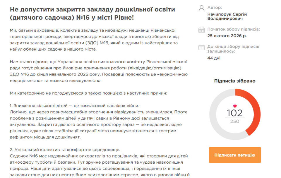 У Рівному стартував збір підписів під електронною петицією до місцевої влади з вимогою не допустити закриття дитсадку №16.
