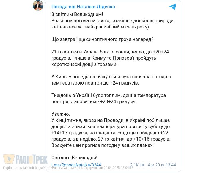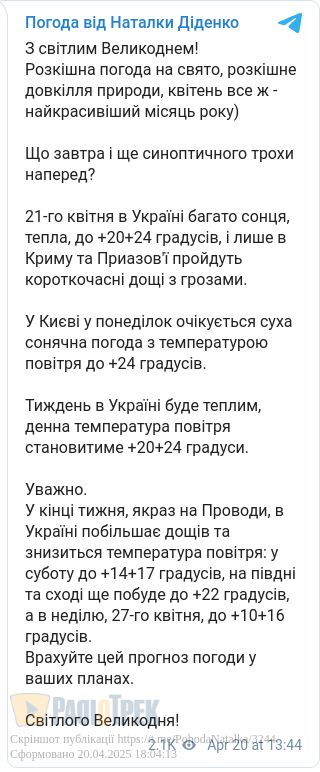 Завтра, 21 квітня, в Україні багато сонця. Очікується до +20...+24 градусів. Дощі з грозами пройдуть лише в Криму та Приазов'ї, повідомила синоптик Наталка Діденко.