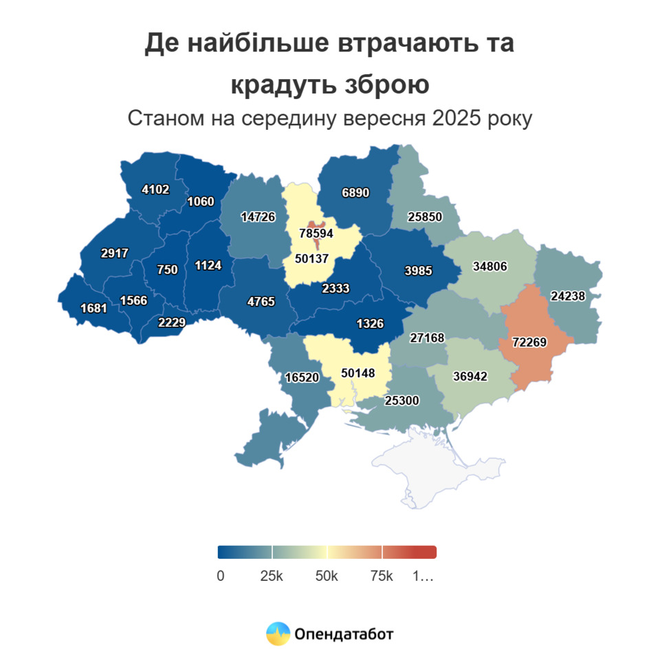Найбільше її втрачають у столиці, на Донеччині та Миколаївщині. Здебільшого це автомати, мисливські рушниці, бойові пістолети. Найменше зброї зникло на Тернопільщині.