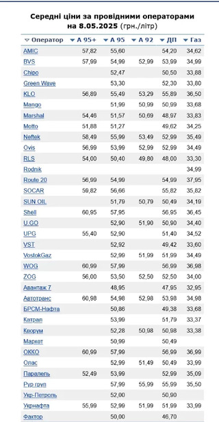 За даними Консалтингової групи «А-95», 8 травня українські АЗС продають бензин А-95 у середньому по 54,64 грн/л. Що на 1 коп. нижче, ніж днем раніше.
