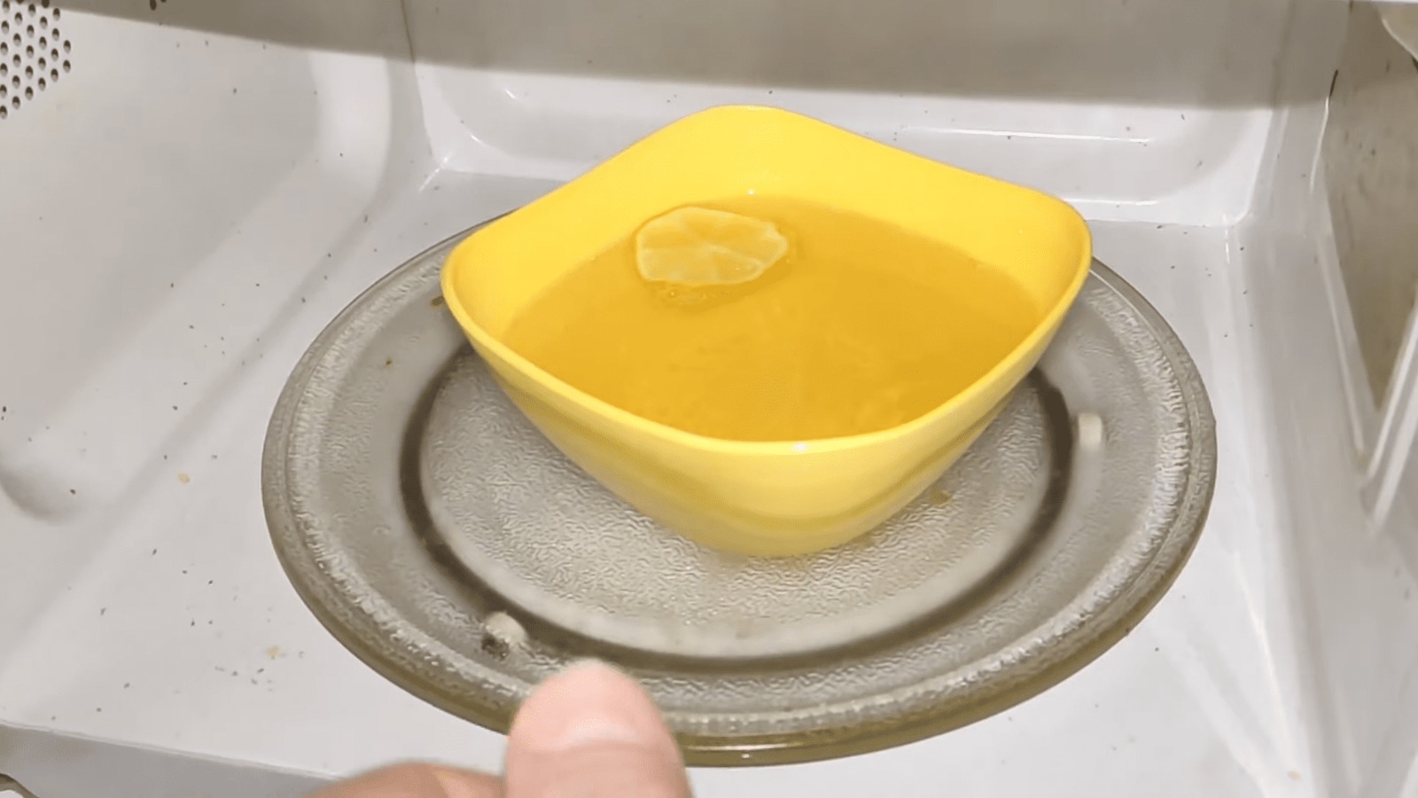Візьміть миску, яку можна ставити в мікрохвильовку, налийте туди води (трохи більше половини) і додайте скибочку лимона та 1–2 ложки оцту.