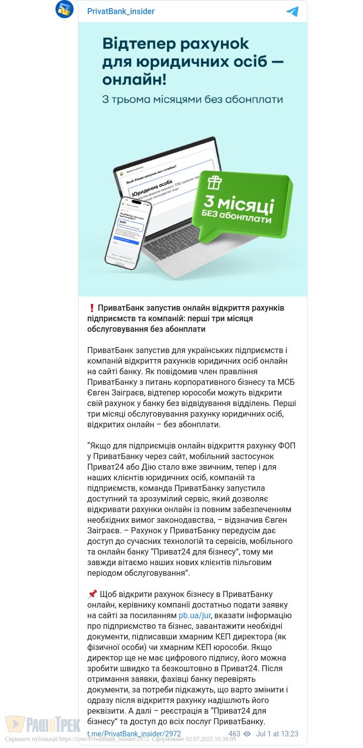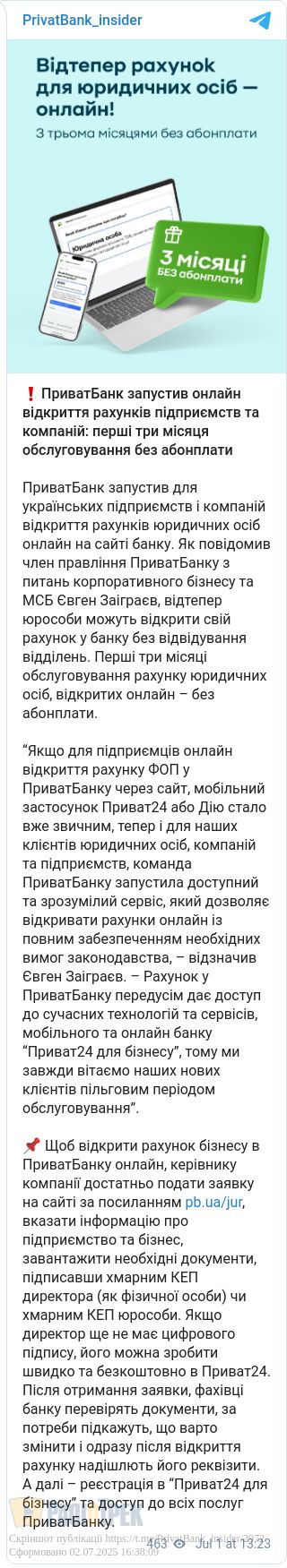 Перші три місяці обслуговування рахунку юридичних осіб, відкритих онлайн – без абонплати, повідомив член правління банку Євген Заіграєв.