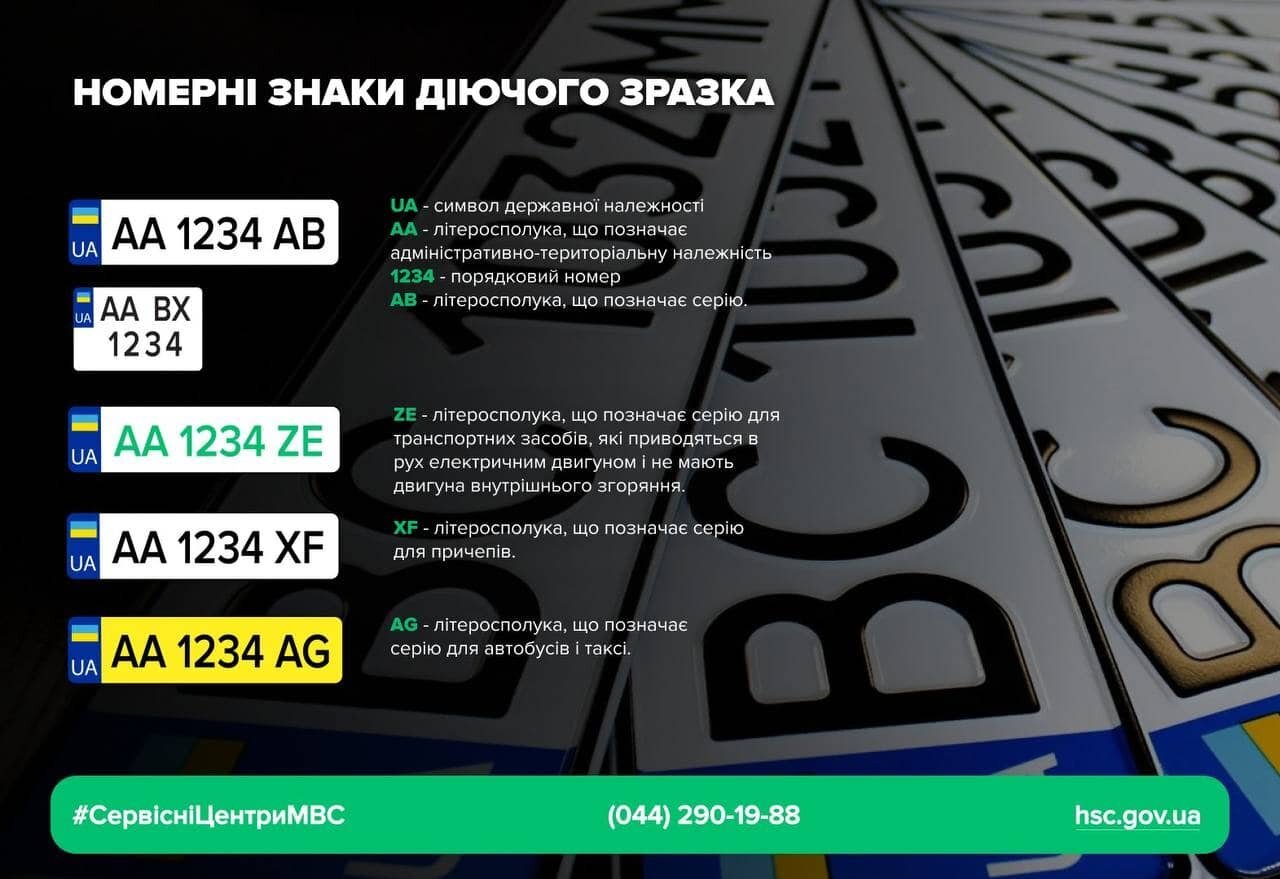 Нові номери мають код регіону (дві літери), чотири цифри, серію літер і позначку UA зі смужкою українського прапора. Для електромобілів передбачені зелені номери.