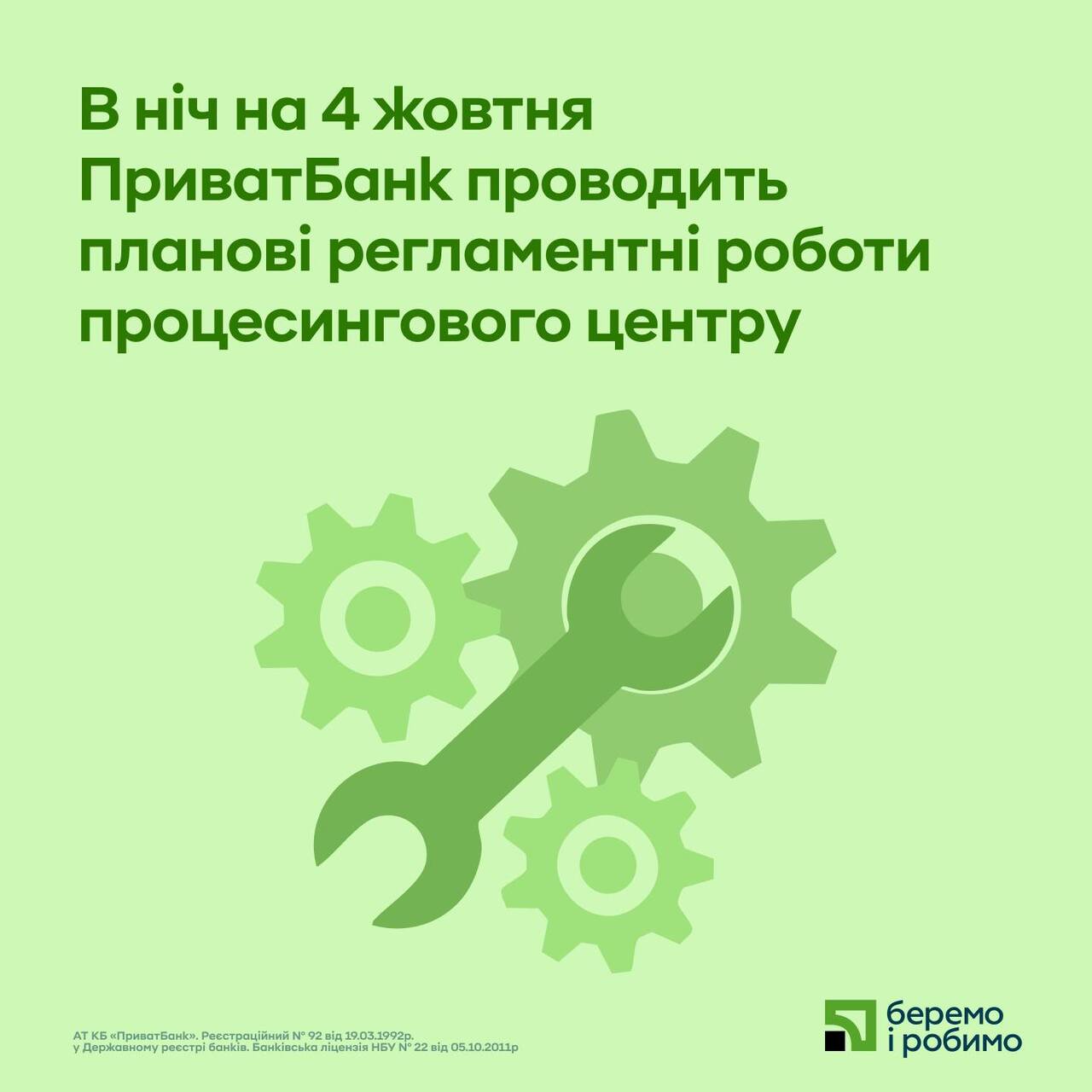 У ніч з 3 на 4 жовтня 2025 року ПриватБанк проводить регламентні роботи процесингу. Про це фіну станова повідомила на своїй сторінці у Фейсбуці.