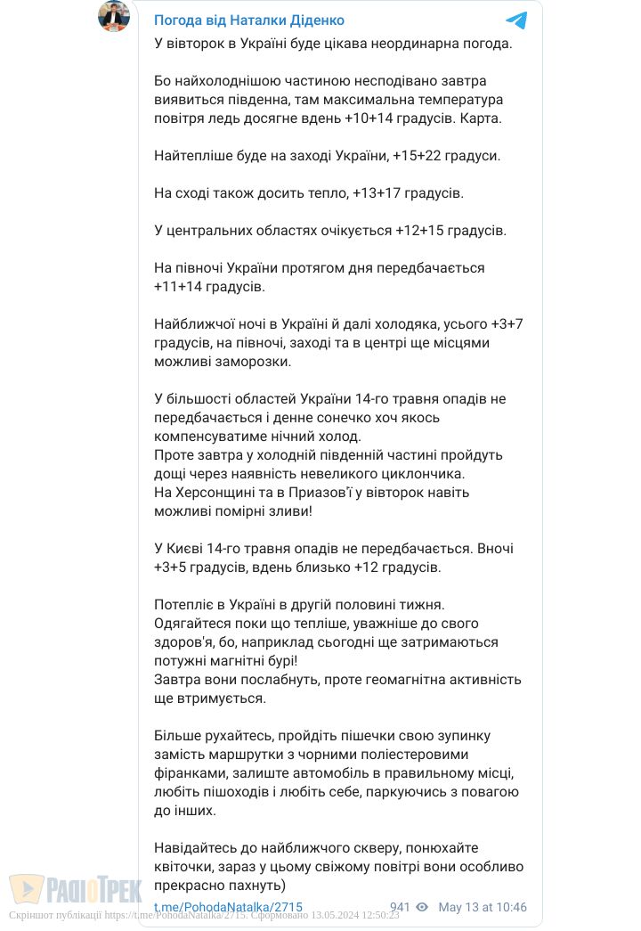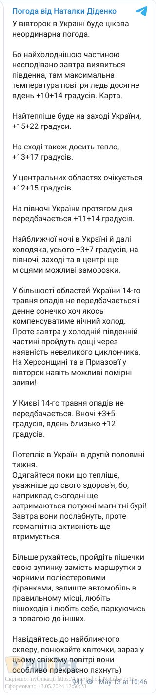 У середу в країни очікується +13...+16 градусів, лише на Закарпатті буде тепліше, до +17...+20 градусів. Дощі, можливо з грозами, пройдуть на Півдні України (окрім Одещини), у східних областях, місцями в Центрі та в Карпатах.