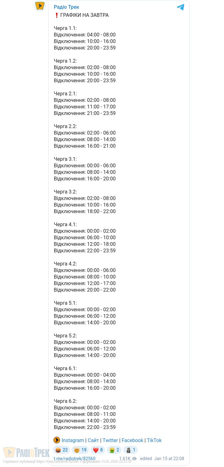 У зв’язку зі складною ситуацією в енергосистемі держави «Укренерго» дало команду запровадити на Рівненщині у п'ятницю, 16 січня, графік погодинних відключень електроенергії: