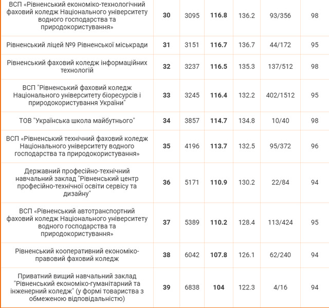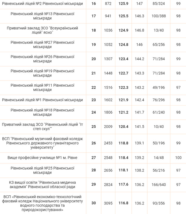 Загалом рейтинг гавчальних закладів Рівного за результатами НМТ – 2025 виглядає так: