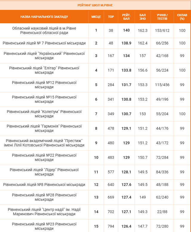 ТОП – 10 ліцеїв Рівного за результатами НМТ – 2025 виглядає так: