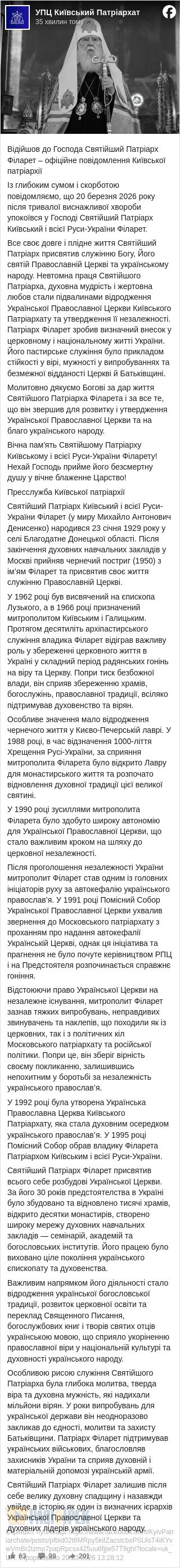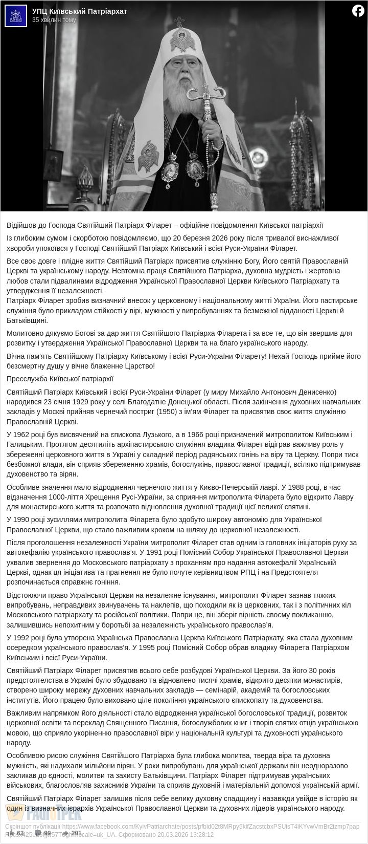 Із глибоким сумом і скорботою повідомляємо, що 20 березня 2026 року після тривалої виснажливої хвороби упокоївся у Господі Святійший Патріарх Київський і всієї Руси-України Філарет.
