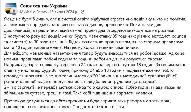 Громовий також виклав фото допису у групі «Союз освітян України», в якому йдеться, що за таких умов змін у зарплаті не передбачається. Тобто, години навантаження збільшаться суттєво, а гроші будуть ті ж самі.