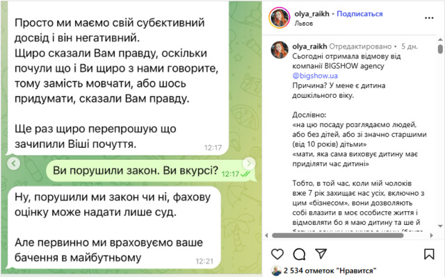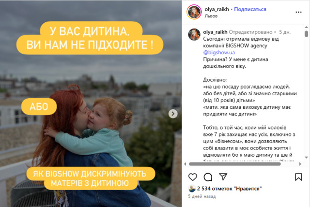 В Україні розгорівся скандал навколо агенції BIGSHOW, яка займається організацією концертів. Жінці відмовили у працевлаштуванні після того, як дізналися, що вона має маленьку дитину.
