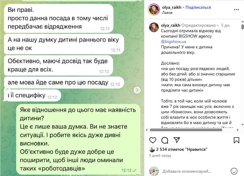 «Так буде краще для всіх»: у Львові рекрутери не взяли дружину захисника на роботу, бо має дитину (ФОТО)
