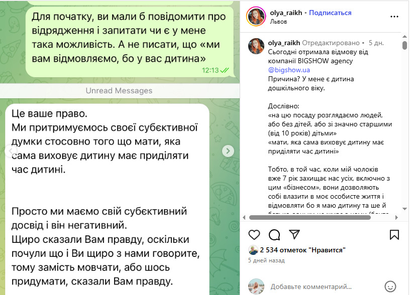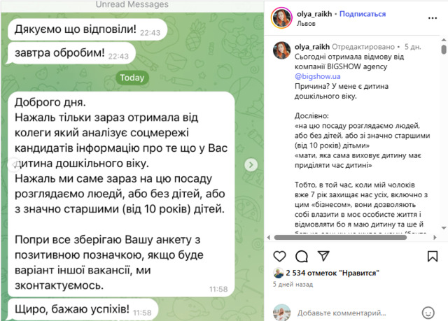 Та вже наступного дня їй надійшла відмова. Причиною назвали те, що у соцмережах знайшли фото з її маленькою донькою. У повідомленні йшлося, що вакансія підходить лише тим, хто не має дітей або чиї діти значно старші. Представники агенції пояснили, що посада передбачає відрядження, а «для маленької дитини це не буде ок».