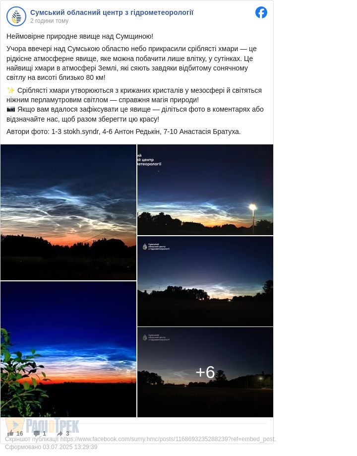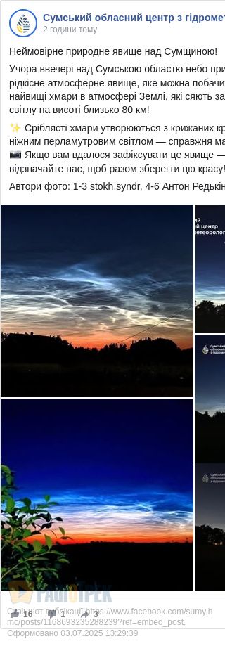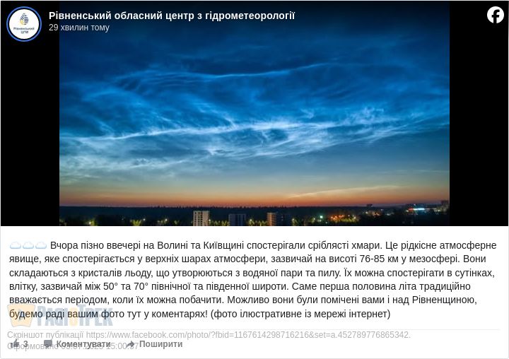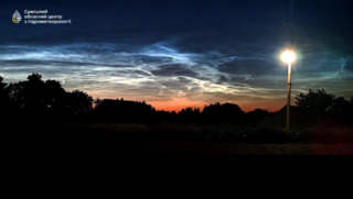 Вечірнє небо прикрасили сріблясті хмари. Вони найвищі хмари в атмосфері Землі та сяють завдяки відбитому сонячному світлу на висоті близько 80 км, повідомили в гідрометцентрі Сумщини.