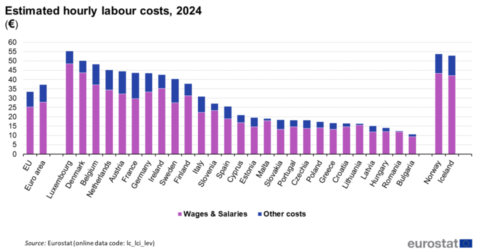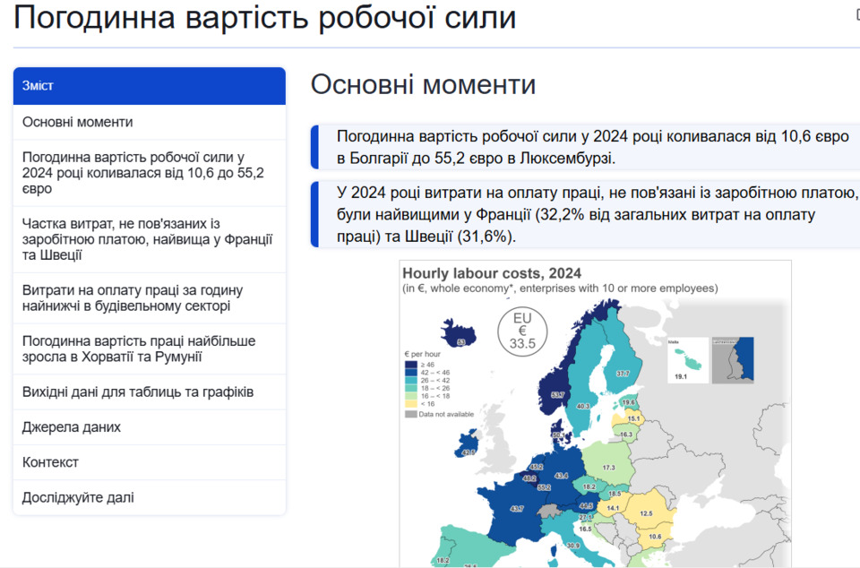 Євростат, орієнтуючись на дані 2024 року, до таких відносить Угорщину, де платять 14,1 євро на годину, Румунію із зарплатою 12,6 євро на годину і Болгарію, за працю на благо якої людина отримає лише 10,6 євро на годину.
