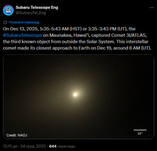 Телескоп Subaru отримав дивовижне зображення міжзоряної комети 3I/ATLAS і зафіксував зміни в її хімічному складі. Це дослідження допомогло вченим краще зрозуміти, як формуються планети та планетні «зародки».