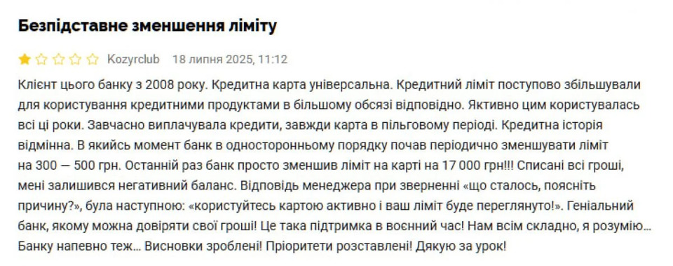 Клієнтка ПриватБанку поскаржилась, що без пояснень їй зменшили кредитний ліміт на 17 тисяч гривень. Через це на картці виник «мінус».