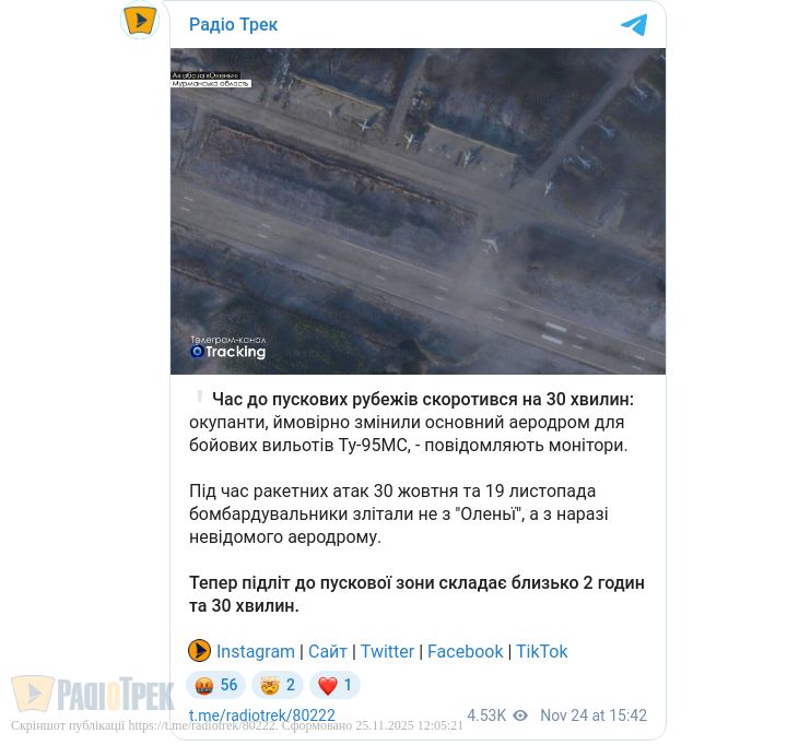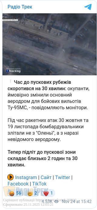 Росія більше не використовує авіабазу Оленья на Кольському півострові для бойових вильотів стратегічних літаків Ту-95МС, які завдають ракетних ударів по Україні.