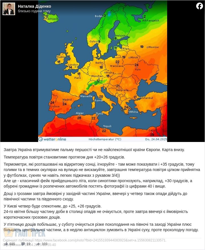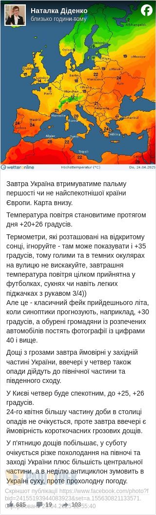 Термометри, які розташовані на відкритому сонці, ігноруйте – там може показувати і +35 градусів, тому голими та в темних окулярах на вулицю не вискакуйте, завтрашня температура повітря цілком прийнятна у футболках, сукнях чи навіть легких піджачках з рукавом 3/4, – повідомила синоптик Наталка Діденко