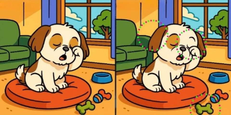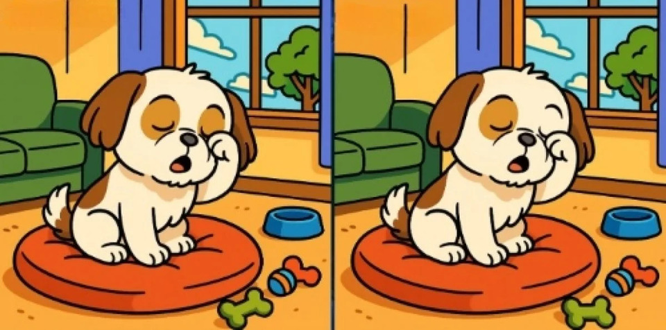 Нове випробування полягає у пошуку відмінностей. Погляньте на дві майже однакові картинки, на них собака, що щойно прокинувся й тре око. На перший погляд, зображення ідентичні, але між ними заховані три дрібні відмінності.